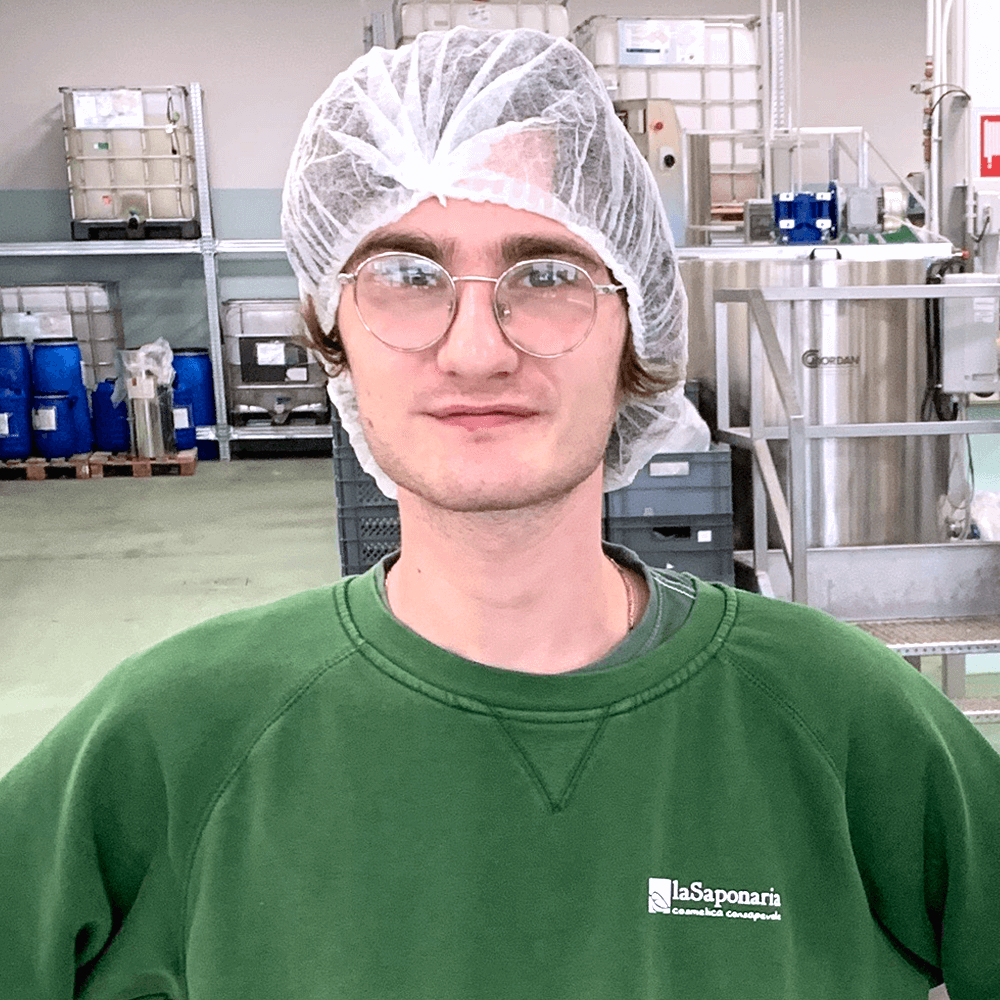 Andrea sta alla produzione dei nostri saponi, ma si occupa anche degli shampoo e delle creme. Super appassionato del suo lavoro, arriva in laboratorio sempre con il sorriso e con una parola gentile per tutti!